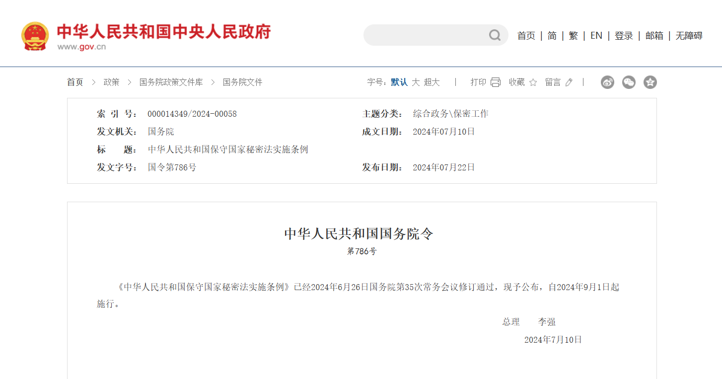 7月22日消息,国务院总理李强日前签署国务院令,公布修订后的《中华人民共和国保守国家秘密法实施条例》(以下简称《条例》),自2024年9月1日起施行。